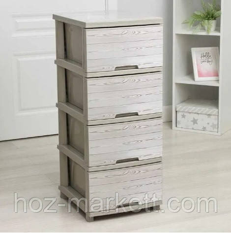 Комод пластиковий із малюнком на 4 ящики "під дерево" є багатофункціональним і стильним. Його можна використовувати як меблі для зберігання невеликих іграшок, ігор, зошитів і письмового приладдя, аксесуарів у ванній, косметики та прикрас у спальні.