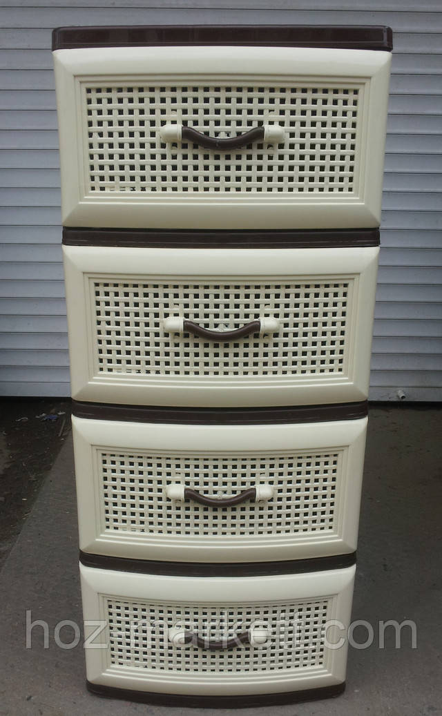 Комод пластиковий великий із сітчастим фасадом бежево-коричневий обладнаний 4 місткими великими шухлядами 19 см завглибшки. Модель має багато застосувань і водночас недорога. Він зберігатиме в повному порядку побутові предмети, офісні документи, одяг невеликих об'ємів, дрібний інструмент, іграшки тощо.