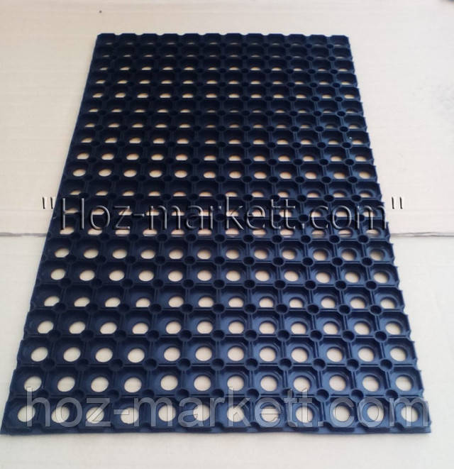 Килимок гумовий "Сота". Застосовується перед вхідними дверима в будинок, квартиру, установи, магазини, аптеки, іншими словами: скрізь, де необхідне чищення перед входом у приміщення. Також можна використовувати як антистатик біля верстатів або на сходових майданчиках або щаблях від ковзання. Не боїться морозу,сонця та вологи. Добре очищає сніг і бруд. Гарний помічник у негоду. Отвори в килимку запобігають накопиченню бруду та піску. Грязь прокидається, що дуже зручно в місцях великого скупчення людей. Стежити за придверними килимками такого типу досить легко — підняти килимок, вимістити з під нього, за потреби промити та можна використовувати далі. Цей килимок ячеристий