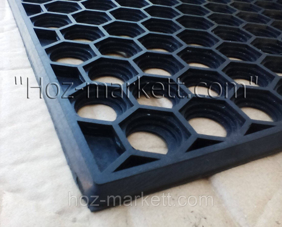 Килимок гумовий "Сота". Застосовується перед вхідними дверима в будинок, квартиру, установи, магазини, аптеки, іншими словами: скрізь, де необхідне чищення перед входом у приміщення. Також можна використовувати як антистатик біля верстатів або на сходових майданчиках або щаблях від ковзання. Не боїться морозу,сонця та вологи. Добре очищає сніг і бруд. Гарний помічник у негоду. Отвори в килимку запобігають накопиченню бруду та піску. Бруд прокидається, що дуже зручно в місцях великого скупчення людей. Стежити за придверними килимками такого типу досить легко — підняти килимок, вимістити з під нього, за потреби промити та можна використовувати далі.